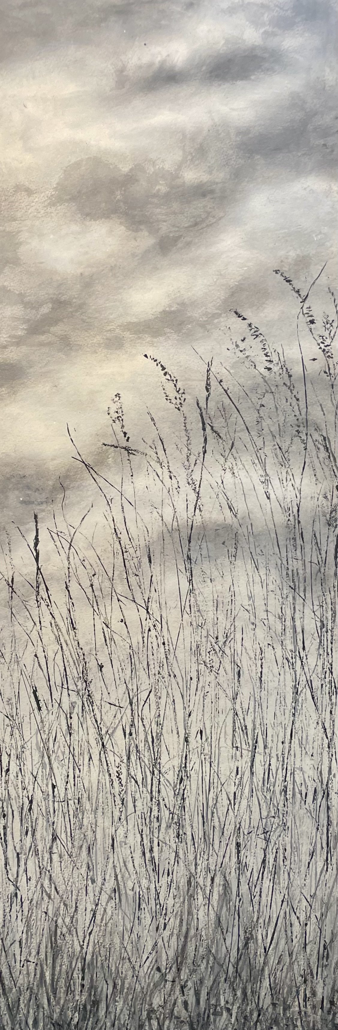 I enjoy the challenges of working with a limited palette. This work was made on papers (including Reeves, cotton rag, and watercolor paper), plain white tissue paper, and pigmented muslin. Several pieces in this collection were created to part of “Black and White” exhibitions.